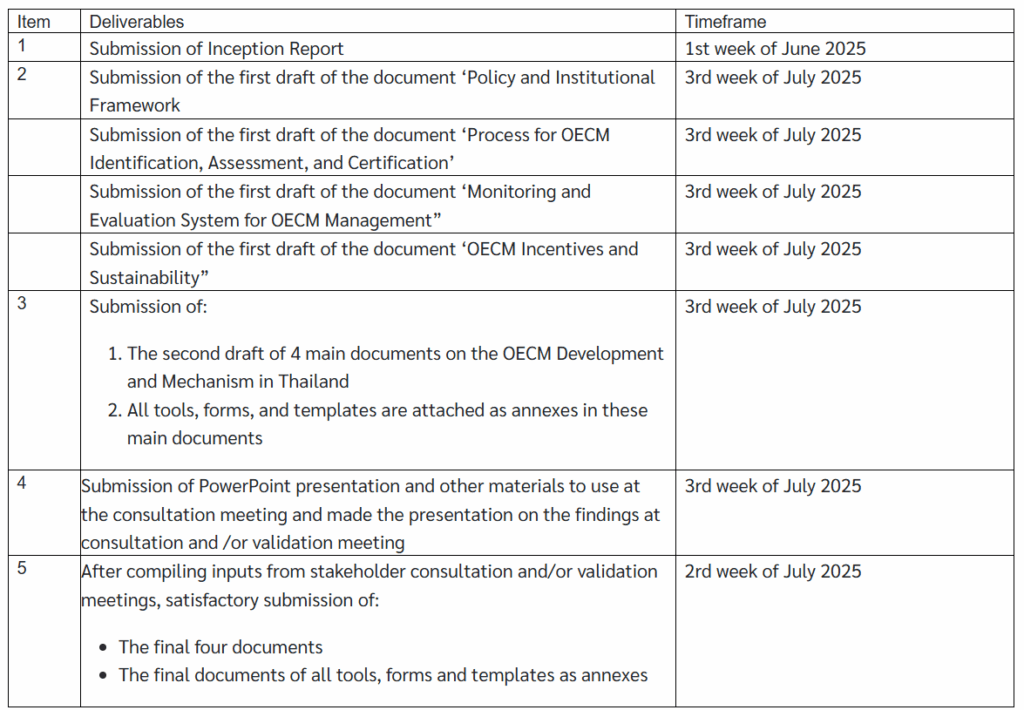 To drive the implementation of OECMs in Thailand in line with the roadmap towards the 30×30 target, the goal is to establish OECMs across the country and develop effective, sustainable action plans that align with the 5th NBSAP 2023-2027 and support the objectives of the Kunming-Montreal Global Biodiversity Framework. This involves creating mechanisms and procedures for certifying or registering OECM areas, along with systems for monitoring and evaluation. Additionally, the collaboration includes managing existing mechanisms and developing measures and incentives to promote the expansion of OECMs, particularly for the public and private sectors, both financially and non-financially. The cooperation also covers the dissemination of information, knowledge, and experiences from pilot areas to increase understanding of OECMs, expanding operational networks among target groups and relevant sectors, and effectively implementing the OECM action plan at the regional level as a model for future management. This approach will ensure integration with national biodiversity action plans and frameworks, the compilation of biodiversity data, traditional knowledge, and ecosystem services in OECM pilot areas, and the incorporation of spatial data into Thailand’s Biodiversity Information Facility (TH-BIF). The primary objectives of this ToR are designed to provide a strategic foundation for the development and implementation of a nationally endorsed Other Effective area-based Conservation Measures (OECM) management mechanism in Thailand. These objectives aim to ensure the process is coherent, inclusive, and aligned with both global targets and Thailand’s national biodiversity priorities. The specific objectives include: