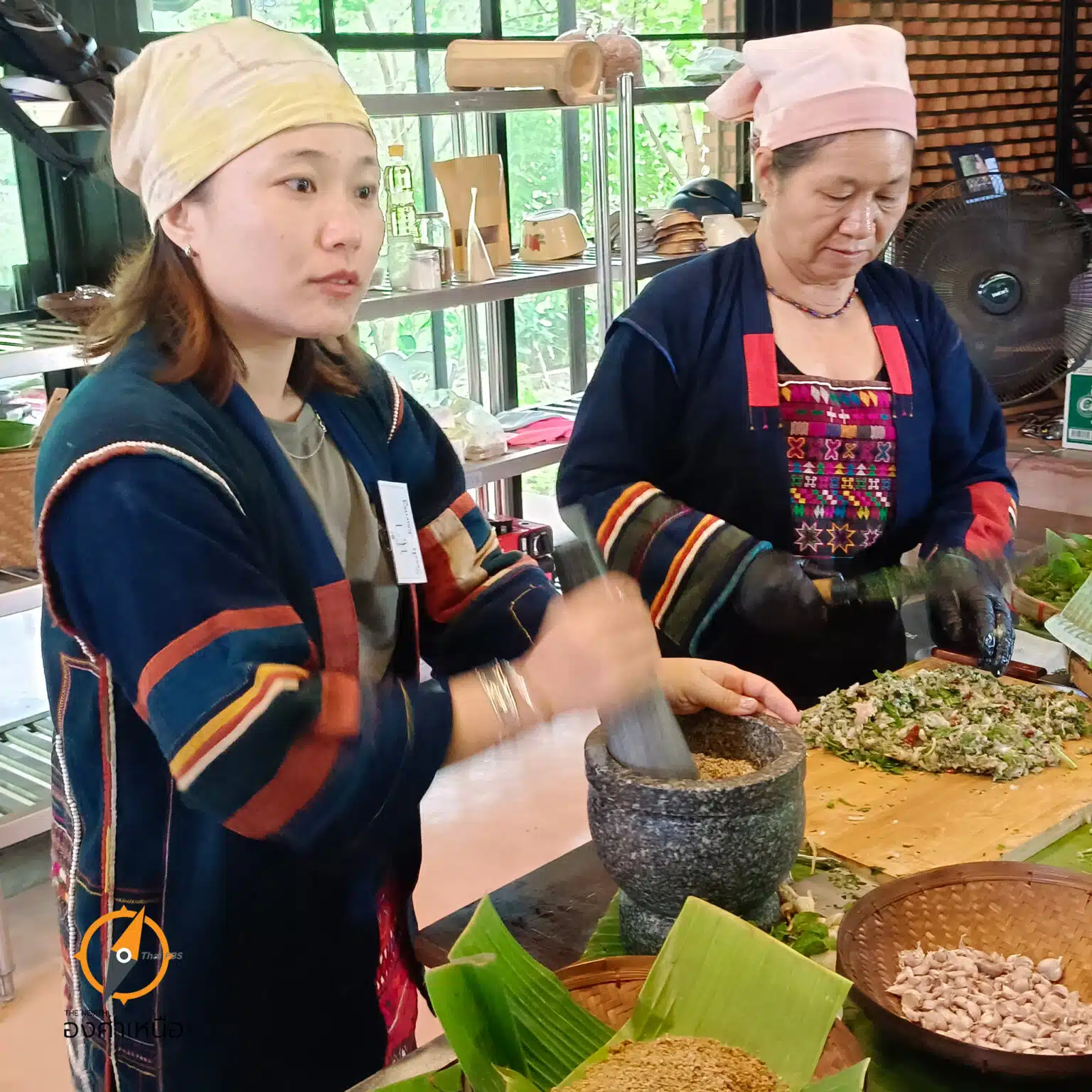 The rainy season brings a vibrant green to the hills of Northern Thailand, where indigenous communities like the Akha and Karen celebrate this abundance through their culinary traditions. At Akha Ama Living Factory in Mae Rim, Chiang Mai, a unique event, “Eat Local, Act Global,” brought together two passionate young chefs: Nam , a youth Akha food enthusiast, and Pachoo, a Karen youth advocate. Both are deeply connected to their roots and committed to showcasing the rich diversity of their local cuisines, passed down through generations. The event featured simple yet exquisite dishes like dried mustard green soup, Akha-style larb, and roasted pork with “wooshi” (วูชิ a chive-like root vegetable), highlighting how local, seasonal ingredients can be transformed into culinary delights.