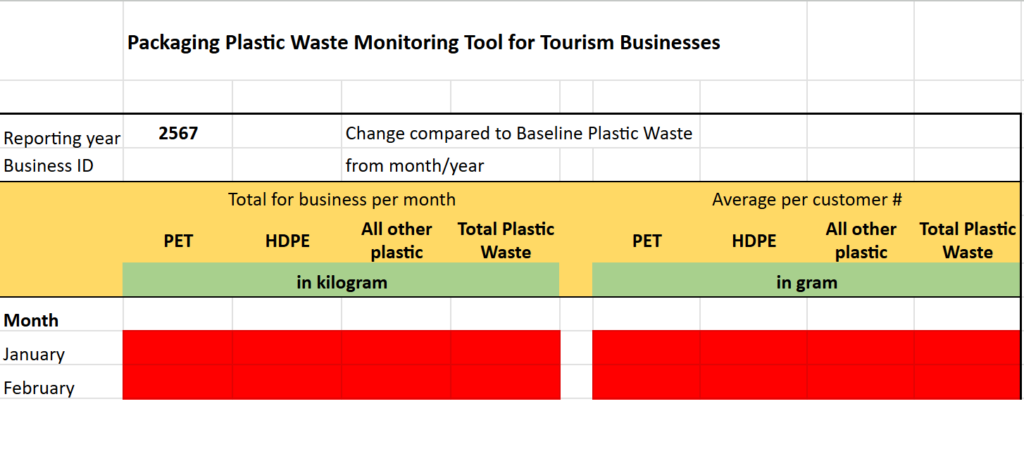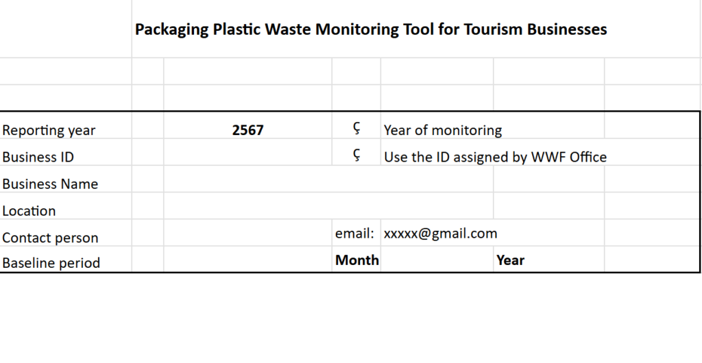 An example of plastic waste and packaging monitoring tool. This monitoring tool has been developed by WWF to support tourism businesses who are participating in the MA-RE-DESIGN project and those who have committed to reducing single-use plastic waste.