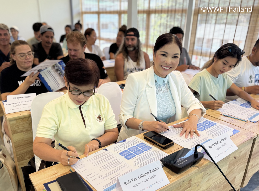 The event was honored by the presence of Mr. Apichart Meepean, Deputy Mayor of Koh Tao Municipality, representing Koh Tao Municipality, Koh Phangan District, Surat Thani Province, who presided over the opening ceremony. The event was also attended by the Koh Tao Tourism Association, led by its President, Mrs. Rumluek Assavachin, along with representatives from the Koh Tao Subdistrict Administrative Organization, Ban Koh Tao School, Village Health Volunteers, the local communities, and tourism business operators in the area. A total of 19 tourism businesses participated in the project and signed the “Plastic-Free Oceans: Commitment from the tourism sector in Thailand”. The participating businesses include: